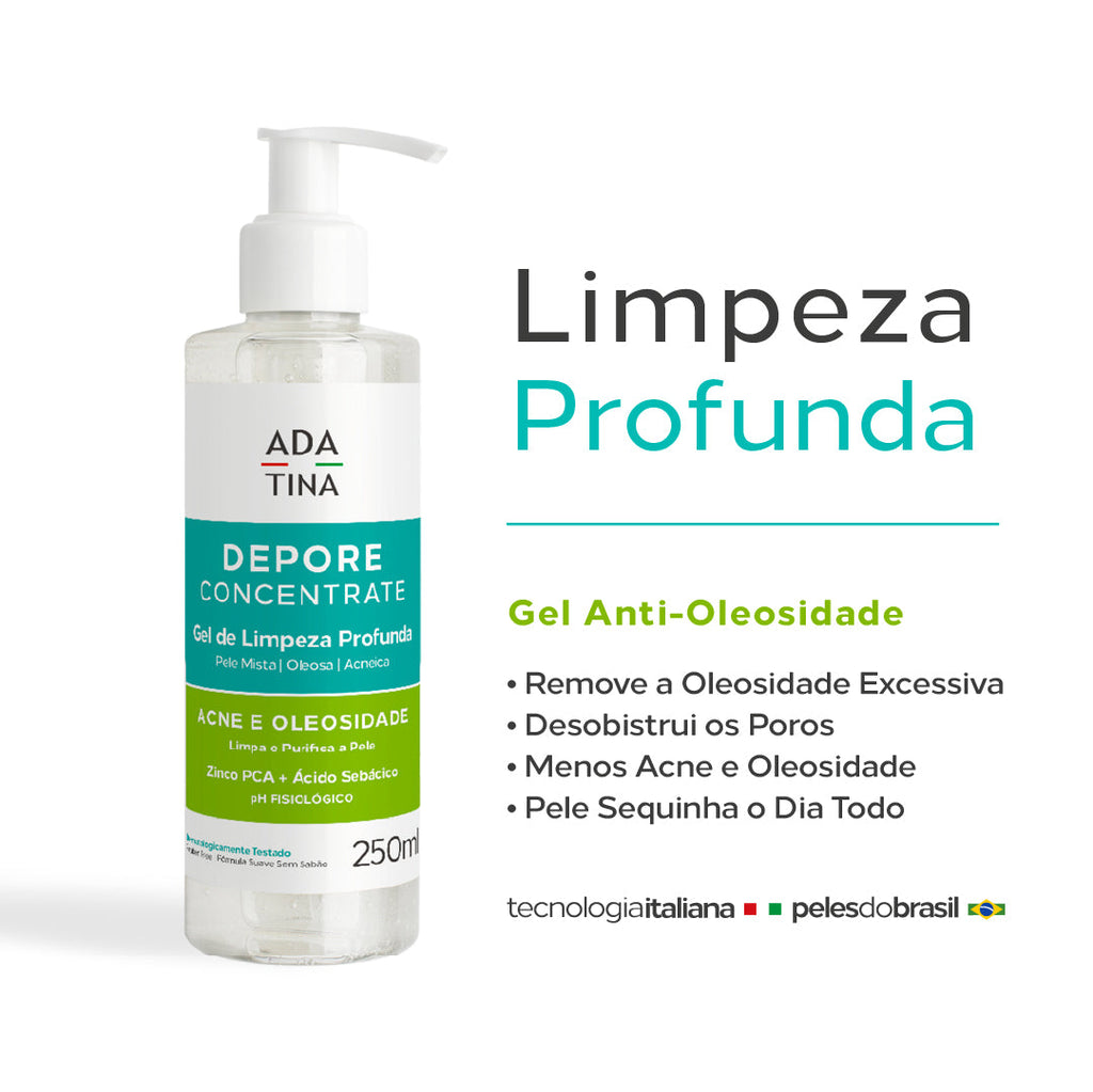 Depore Concentrate é um gel de limpeza dermatológico de alta performance, desenvolvido especialmente para peles oleosas, mistas e acneicas que precisam de controle de oleosidade, redução de poros dilatados e prevenção da acne. Sua fórmula combina Zinco PCA e Ácido Sebácico, ativos reconhecidos na dermatologia, que proporcionam uma limpeza profunda, purificante e segura, removendo o excesso de oleosidade sem ressecar ou agredir a pele.