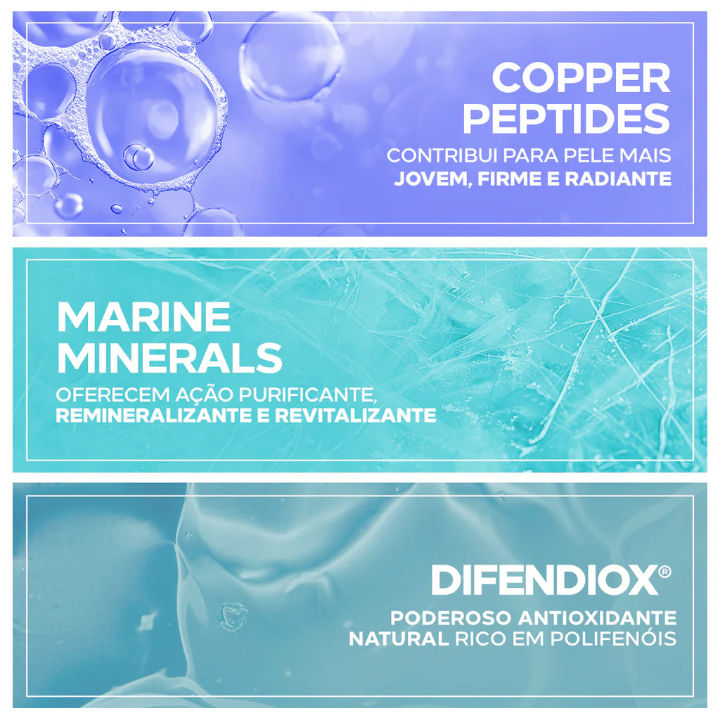 Peptídeos de Cobre → ação antioxidante, anti-idade e reguladora da oleosidade ; contribui para uma pele mais jovem, firme e radiante.